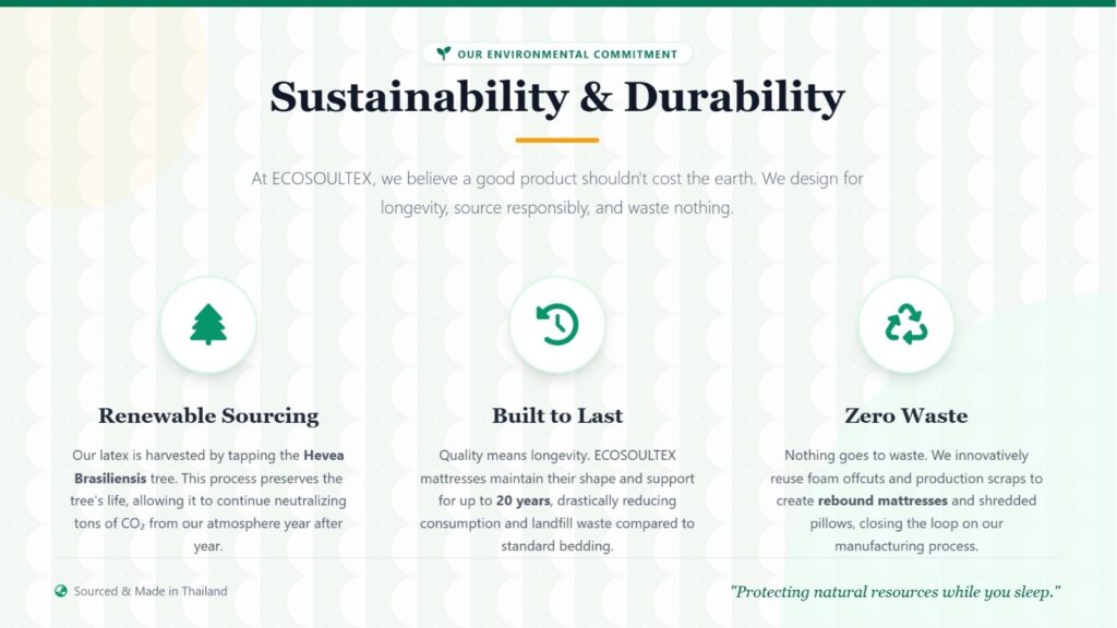 At ECOSOULTEX, sustainability goes hand in hand with longevity. Our natural latex mattresses are engineered for exceptional durability, with a lifespan of up to 20 years—significantly longer than conventional mattresses. This extended product life reduces waste, lowers replacement frequency, and supports the responsible use of natural resources.