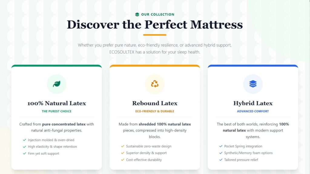With over 20 years of experience, ECOSOULTEX produces a wide range of latex mattress types to meet residential, hospitality, and project requirements:
