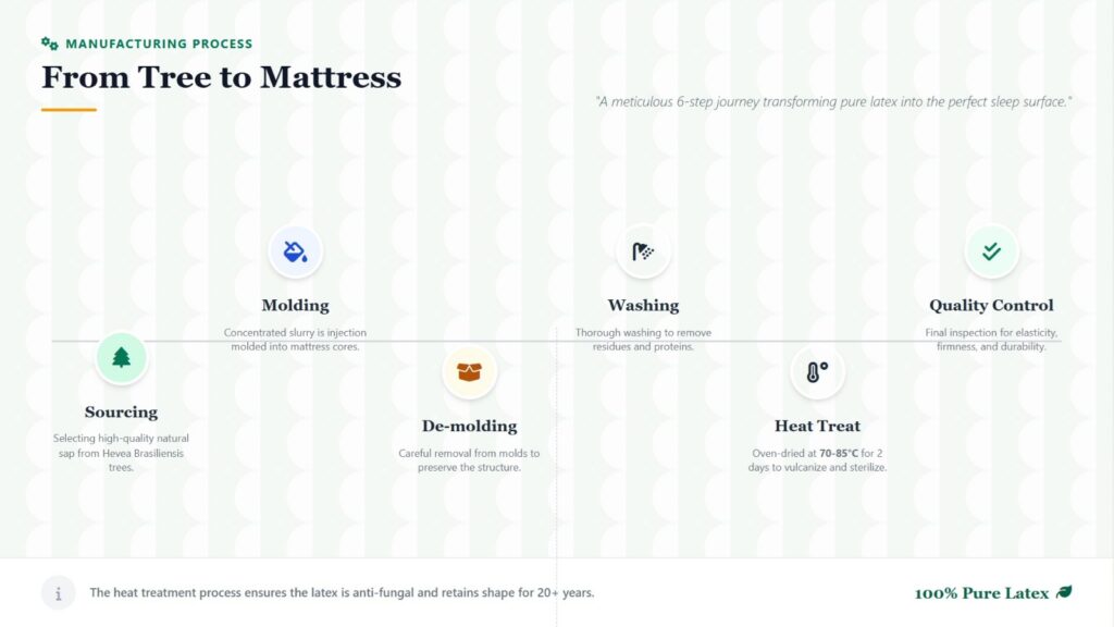 Each latex mattress is produced under strict quality control standards, following a precise manufacturing process that includes latex concentration, injection molding, washing, heat treatment and cooling. This ensures mattresses that offer an ideal balance of firmness and softness, excellent elasticity, and superior shape retention.