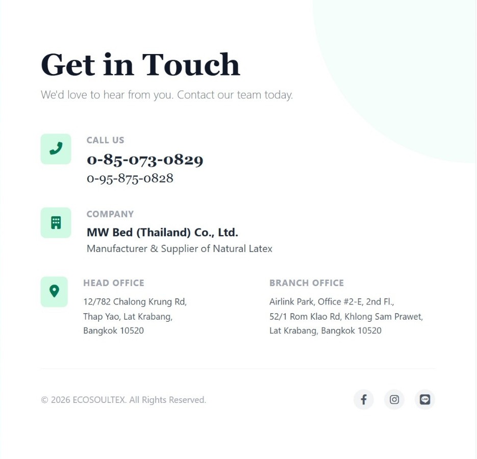 ECOSOULTEX is a trusted mattress manufacturer in Thailand, operating under MW Bed (Thailand) Co., Ltd with over 20 years of industry experience. We specialize in the manufacturing of high-quality mattresses, including 100% latex mattresses, PU foam mattresses, memory foam mattresses, and spring mattresses, using advanced production technology and carefully selected materials.